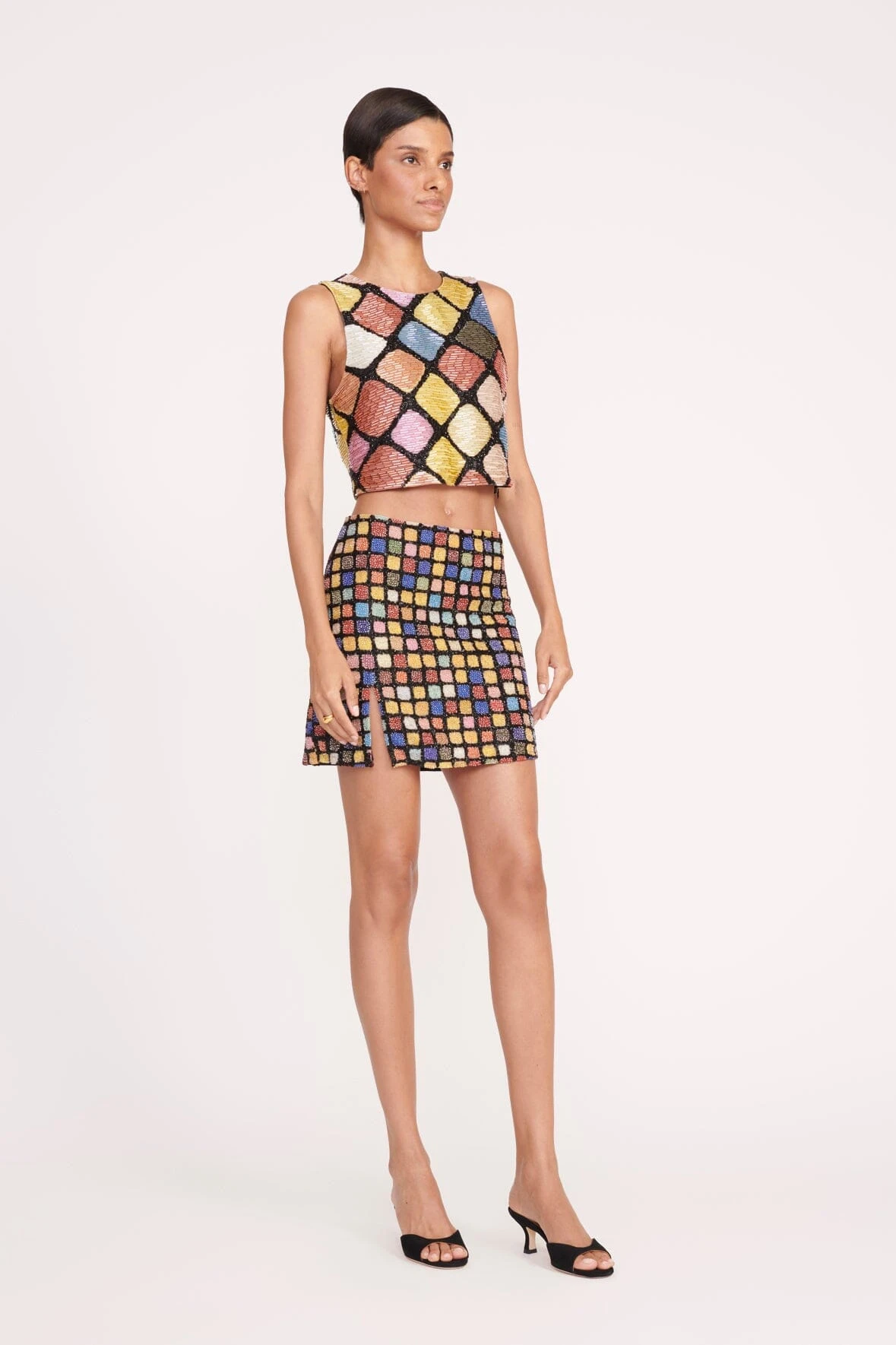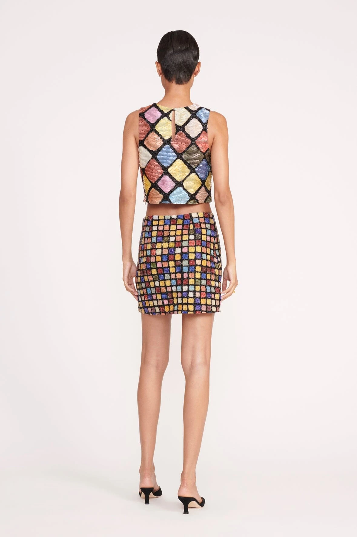 A hand-beaded crop top featuring a festive geometric multicolor pattern. Wear the Alora Top as a statement piece with black trousers or as a matching beaded set with the Emerie Skirt.
