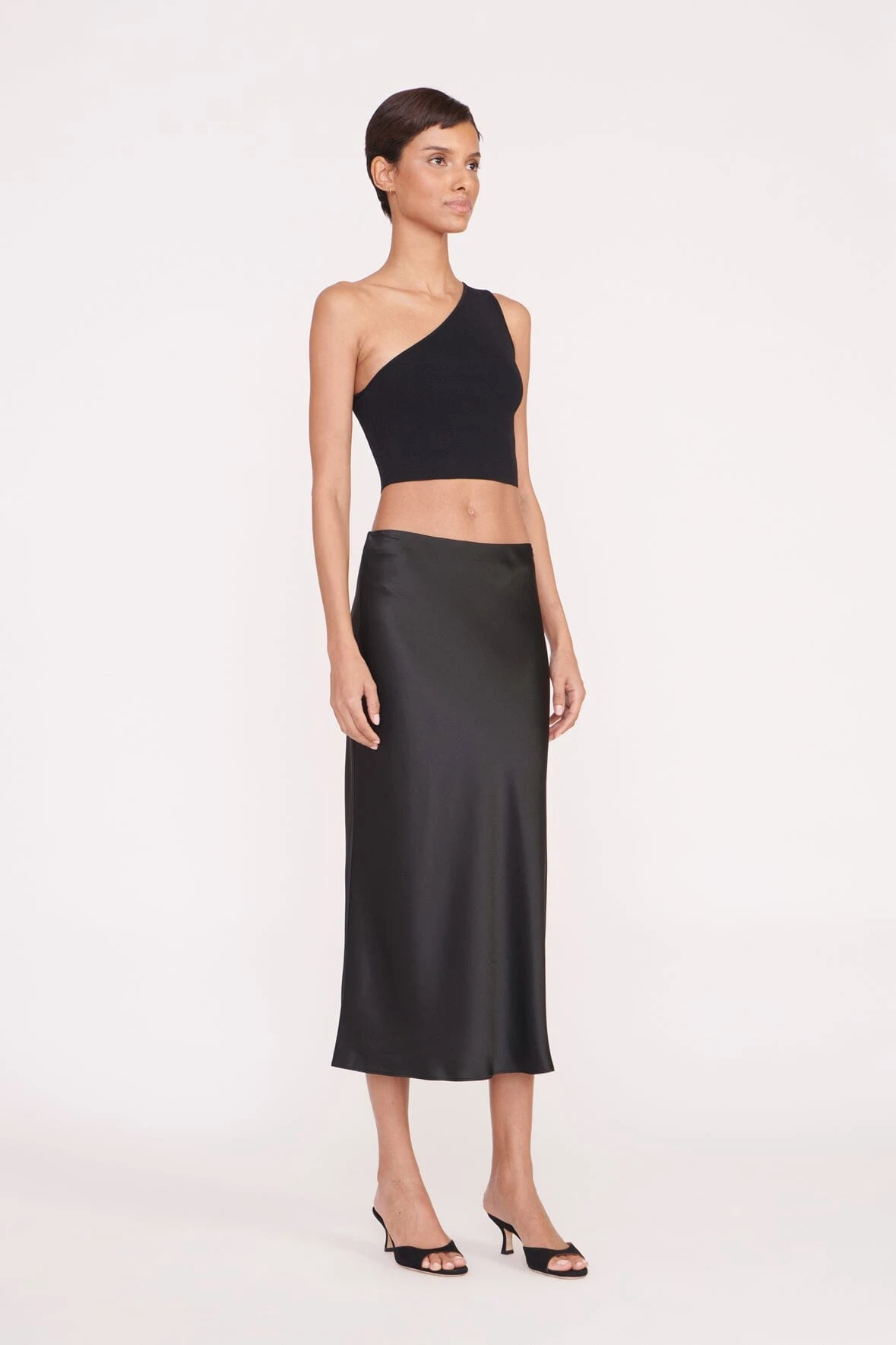 A bias cut, slim fit skirt that hits at the calf, the Angela is constructed out of a shiny satin fabric.