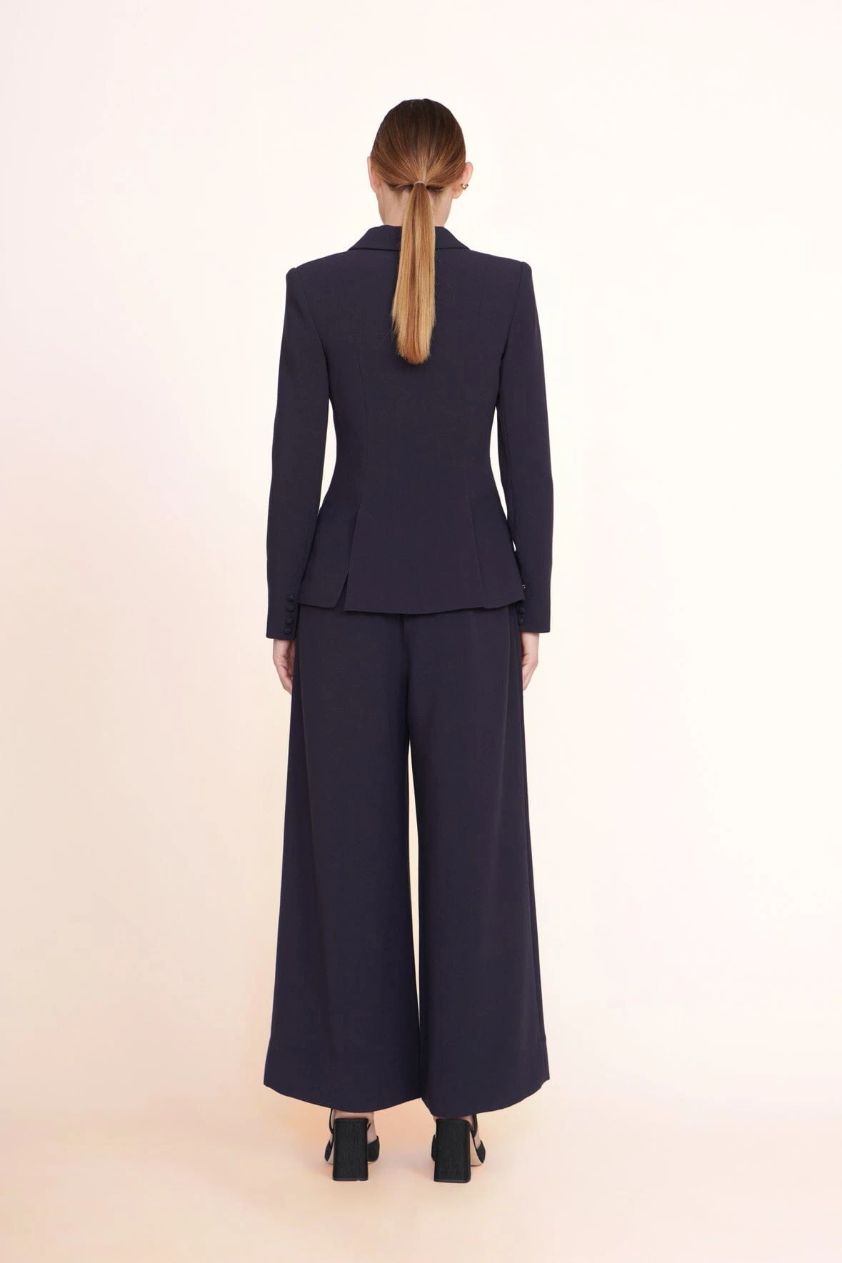 A cropped wide leg pant with corset seaming along a high waist, the Caleb Pant is constructed out of a crepe fabric and features a hidden zipper closure at the side. This style completes a suiting outfit when paired with the Carson Blazer.