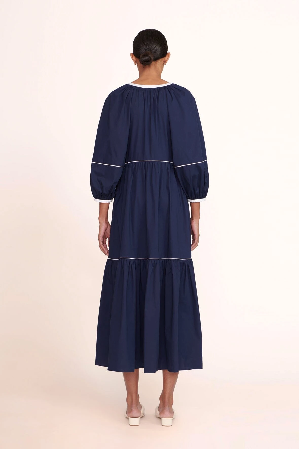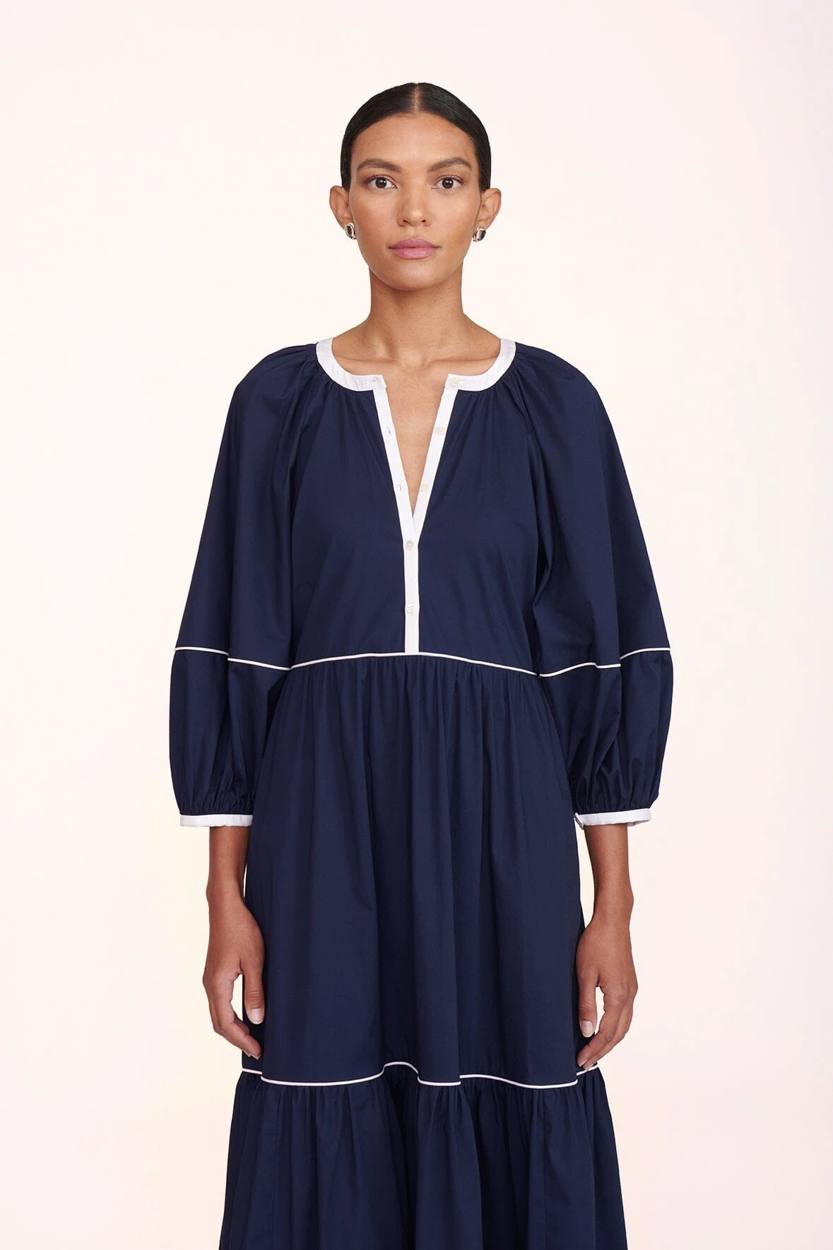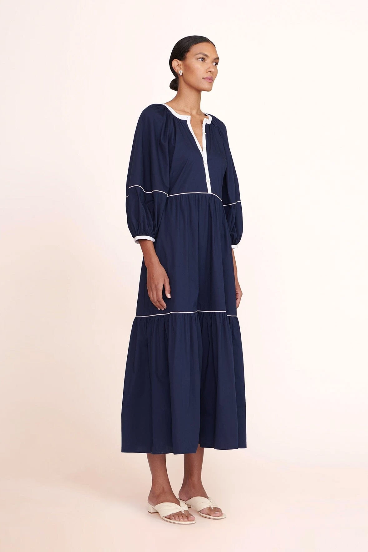 The Demi Dress is a three quarter sleeved maxi dress featuring contrasting trim, a button front, and tiered skirt.