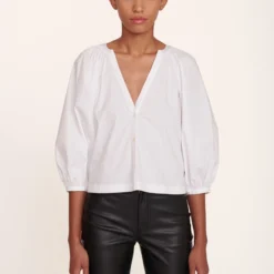 The Dill Top is a cotton poplin button-down with 3/4 puffed sleeves. This classic top can be worn year-round.Â