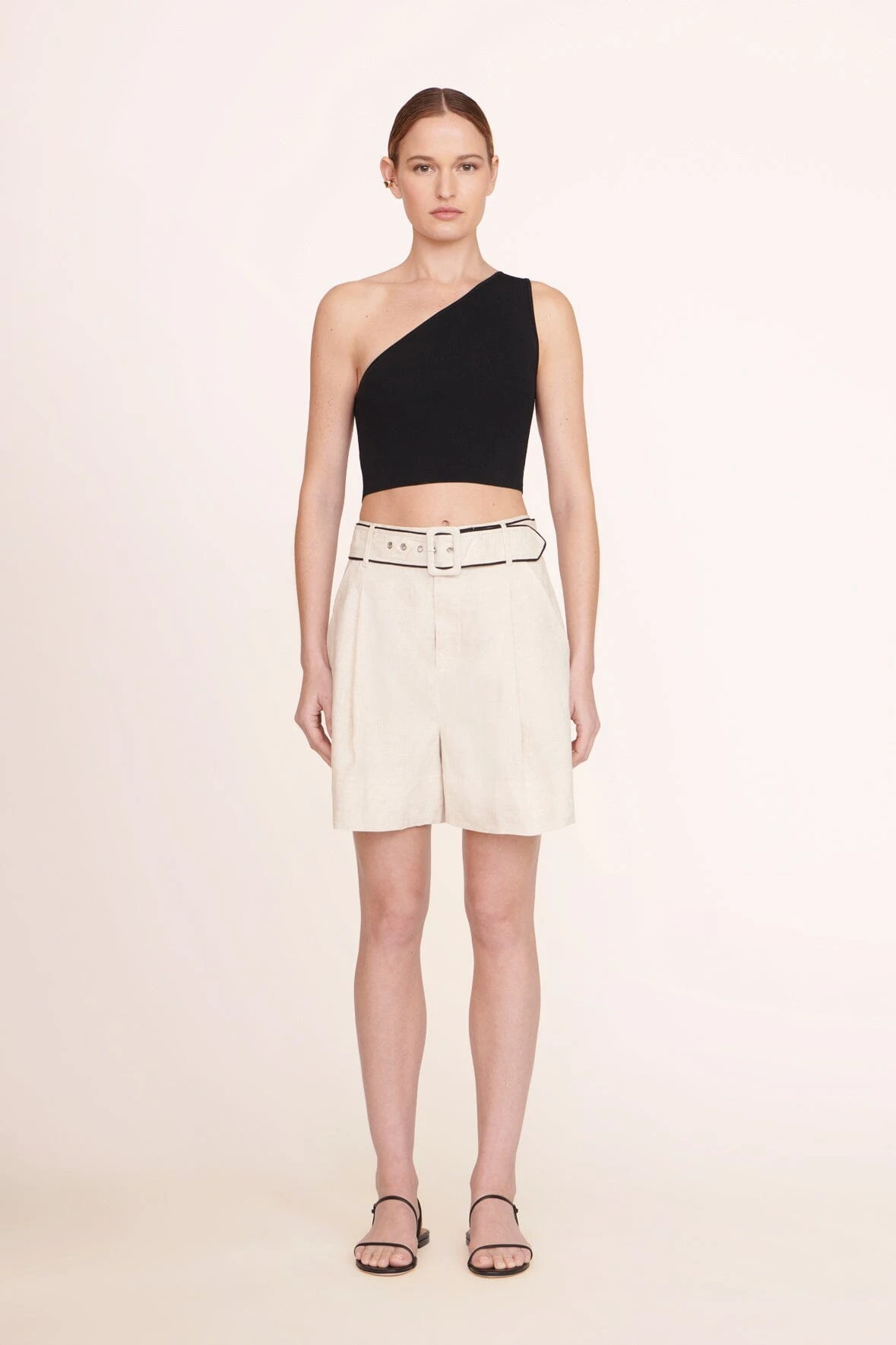 A wide leg bermuda short, the Colin features an adjustable linen buckled belt and is made out of linen.