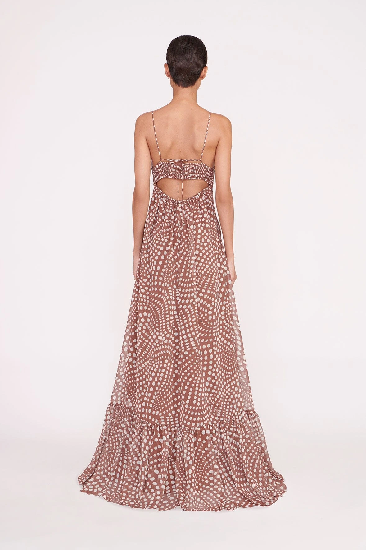 A full length gown constructed out of a printed crinkle chiffon fabric, the Florence Dress offers a fitted empire waistline and flowwy skirt. This style features a peplum hem and spaghetti straps which tie at the back.