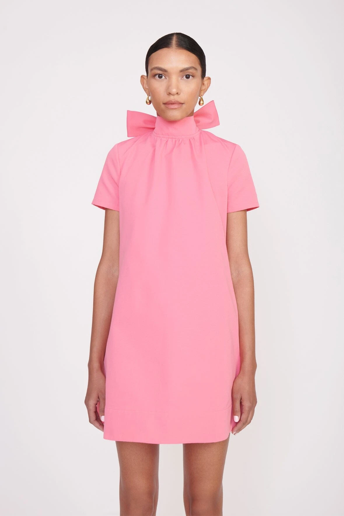 The Mini Ilana is a high neck mini dress with a scoop back and functional, self-tie bow collar. Constructed out of grosgrain fabric, this dress is the perfect statement piece for any occasion.