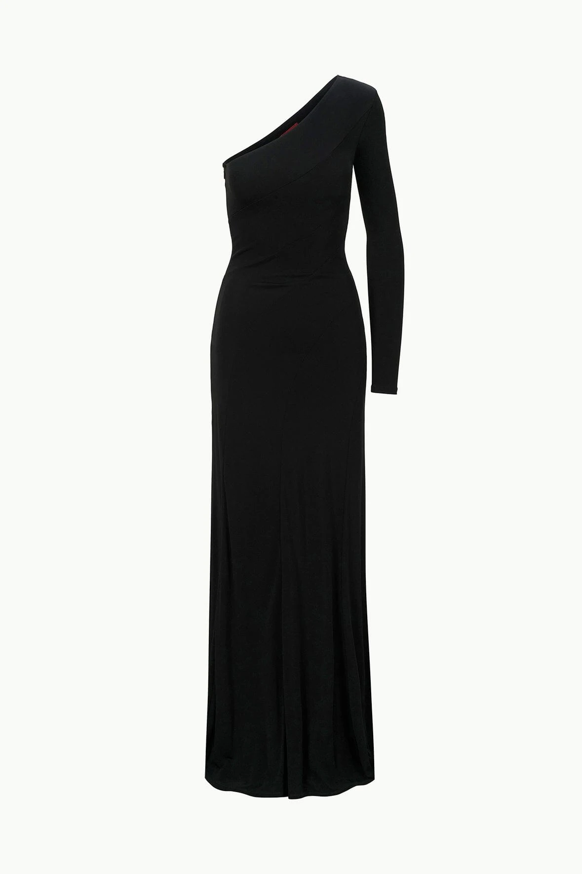 The Serena Dress is a one-shoulder maxi dress with asymmetrical seams throughout the body for a sleek and flattering look. This style is made out of a slinky jersey fabric and features a side zipper.